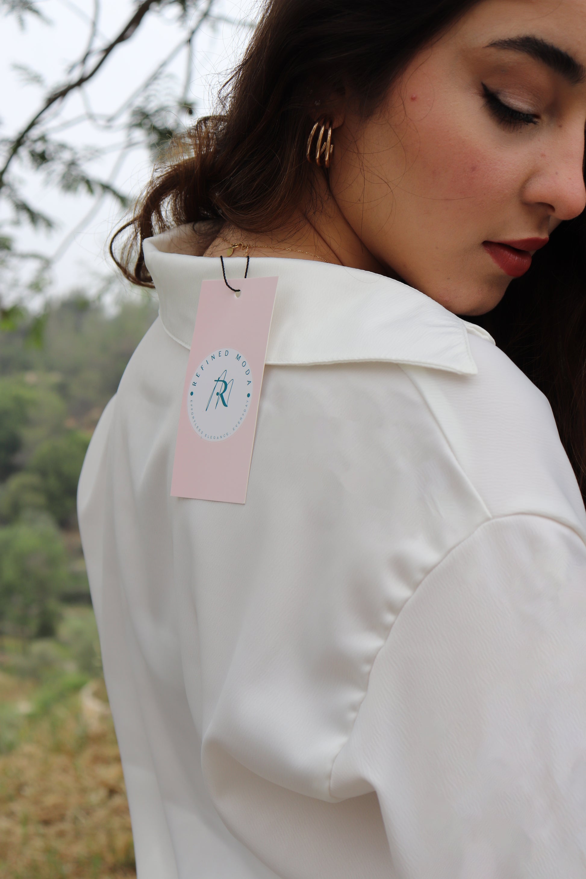 Made from smooth, premium satin for a soft and elegant feel. Features two buttons on each sleeve for a polished touch.